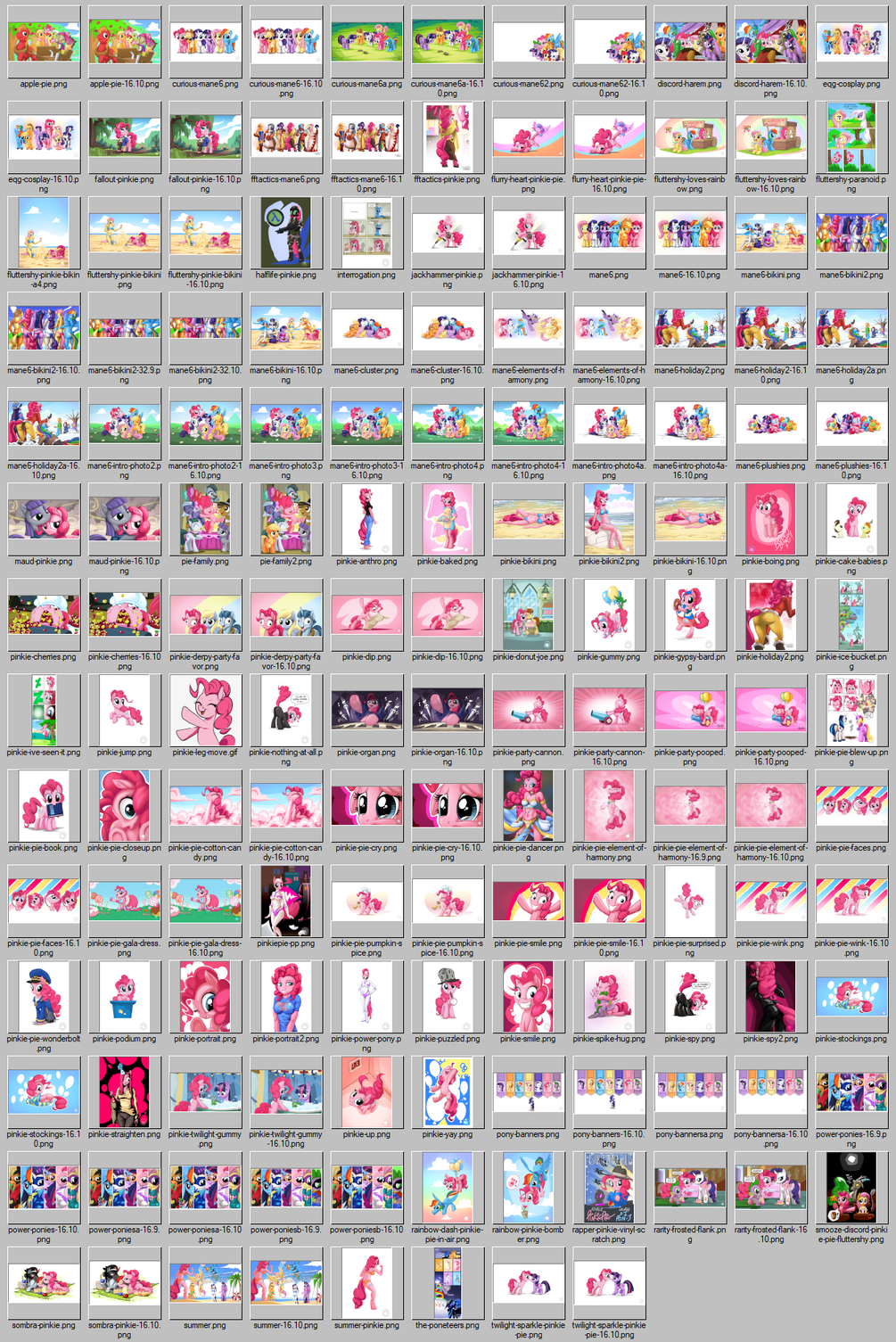- There are solo and group pictures (Pinkie in group pictures). Note: some of these group pictures are also in the other packs (eg. Rainbow Dash Pack, Twilight Sparkle Pack).